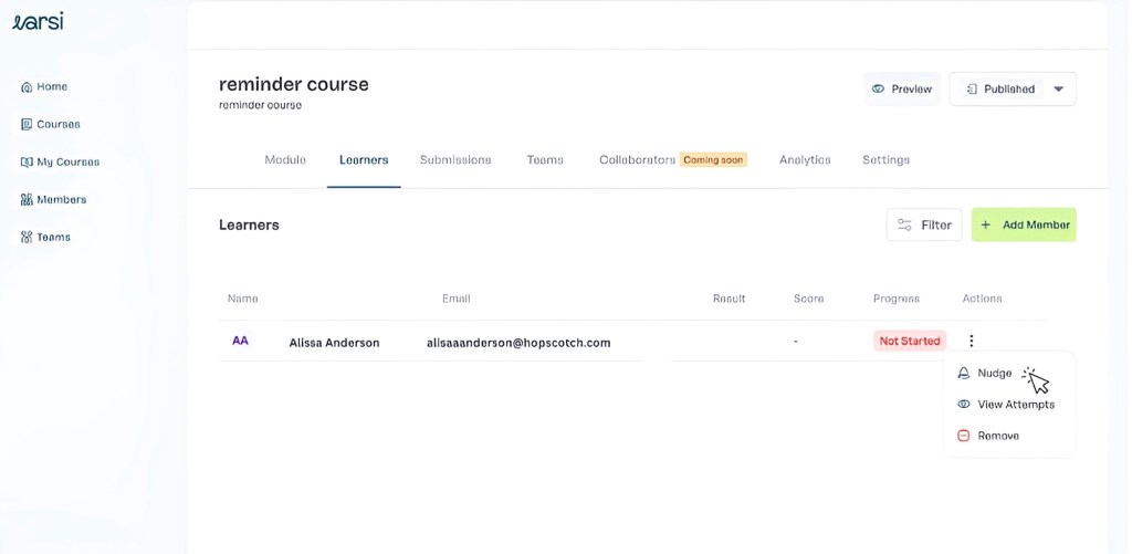 Varsi doesn’t just tell you who finished a course, it shows you who’s active, who’s completed training, how many attempts each learner made, their pass/fail status, and how much time they spent on each module. It’s the kind of depth that reveals both engagement and comprehension. - Spot patterns and performance trends